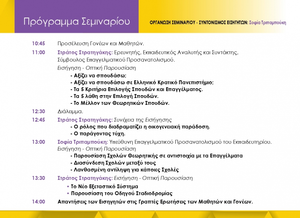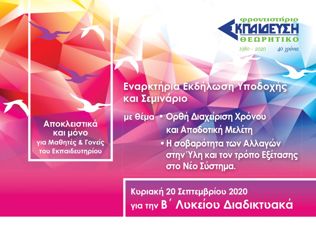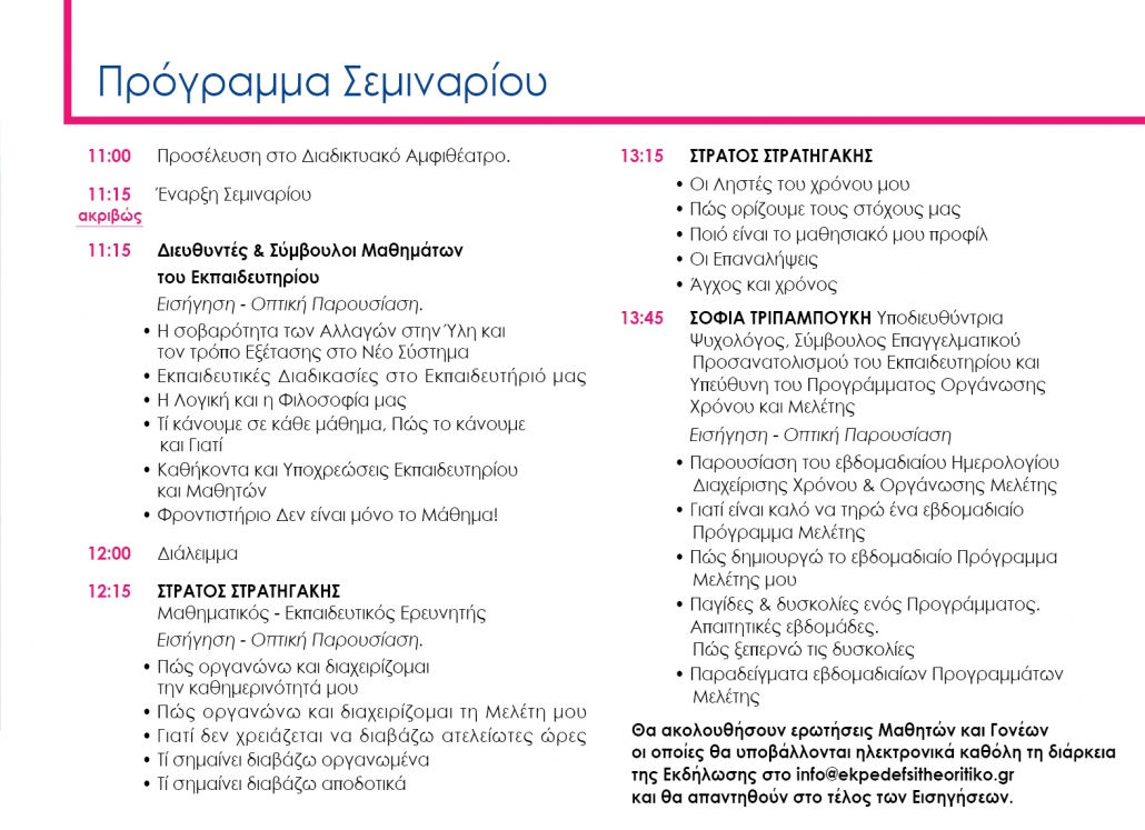 Δείτε εδώ το Αναλυτικό Πρόγραμμα Σπουδών του Φροντιστηρίου μας για το πλήρες πρόγραμμα και τα Ανεξάρτητα Τμήματα Έκθεσης.