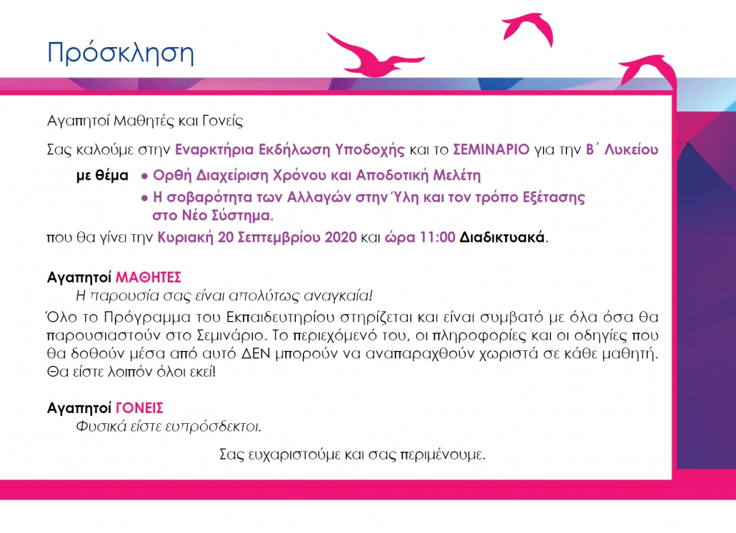 - με την συμμετοχή των μαθητών στα 3ώρα Προσομοιωτικά Διαγωνίσματα από τις 31 Αυγούστου έως τις 5 Σεπτεμβρίου,